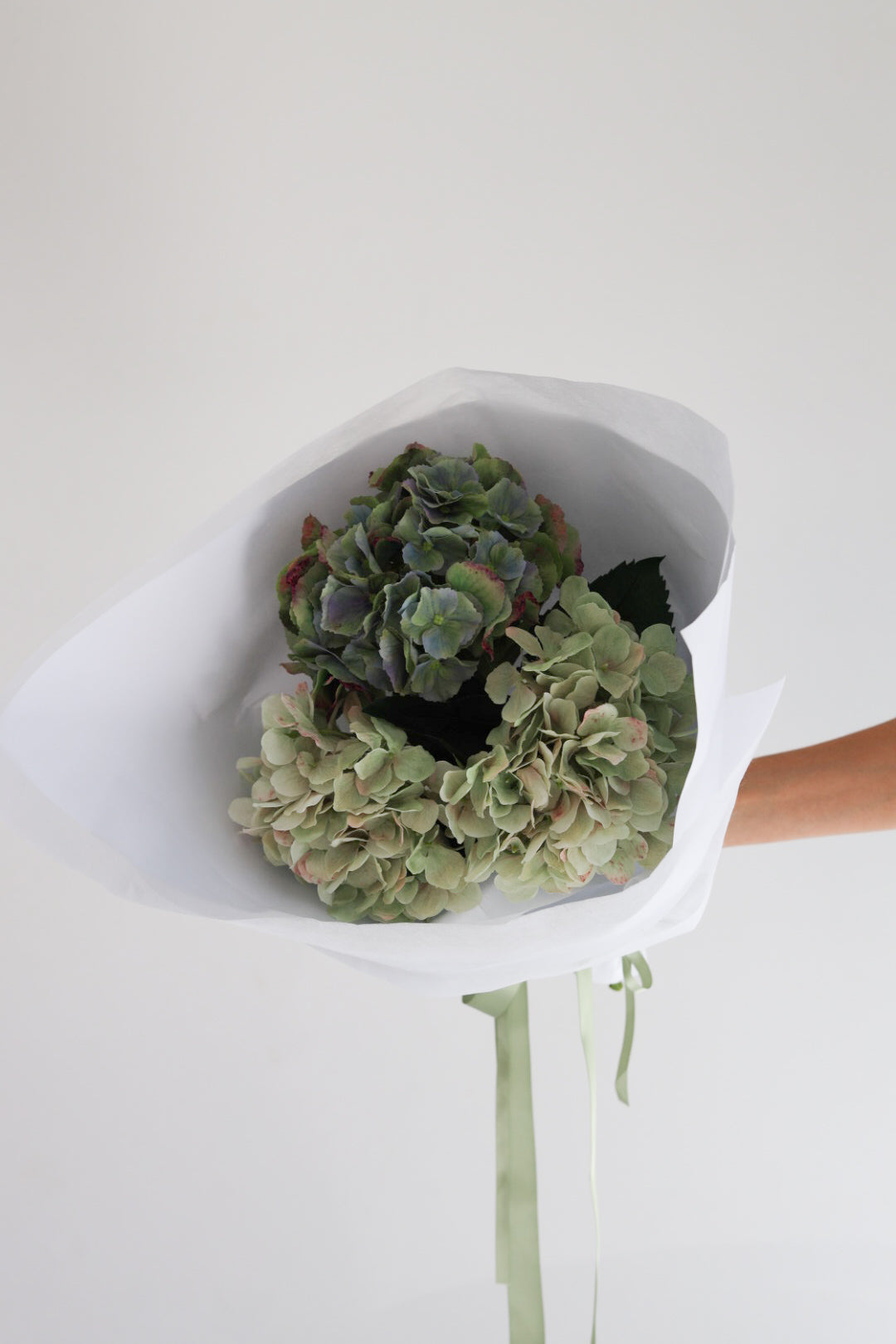 An absolute fave, a bouquet of mixed faux hydrangea in varying greens.