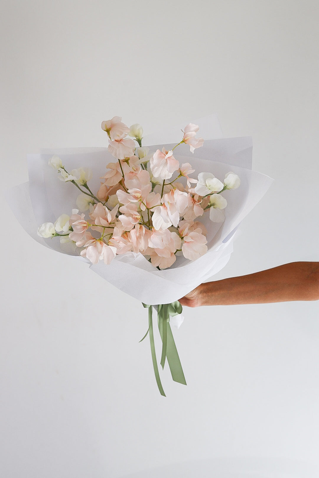 Effortlessly whimsical, a mix of soft pink and white sweetpeas.