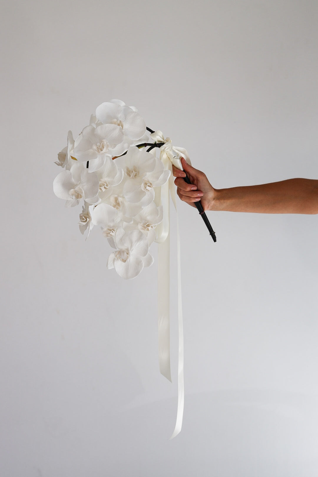 3 cascading all white phalaenopsis orchid stems with stems on show, wrapped with white satin trailing ribbon.